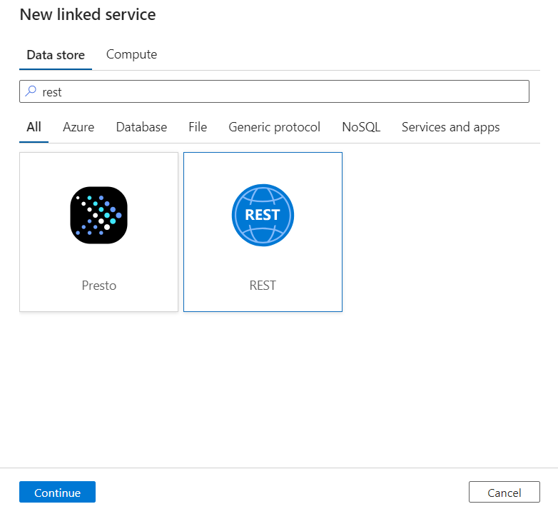On the New linked service pane, search for REST. Select the REST tile and then select Continue.