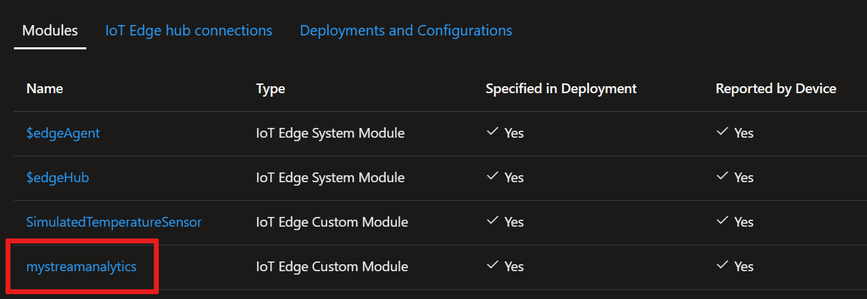 Screenshot showing the name of your Stream Analytics modules in your IoT Edge device in the Azure portal.