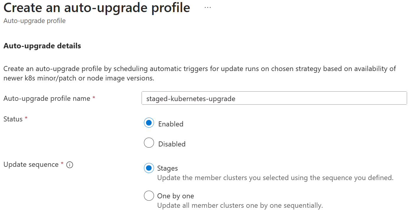 Select Create, enter a name for the profile, and then select whether the profile is Enabled or not. Disabled auto-upgrade profiles don't trigger when new versions are released.