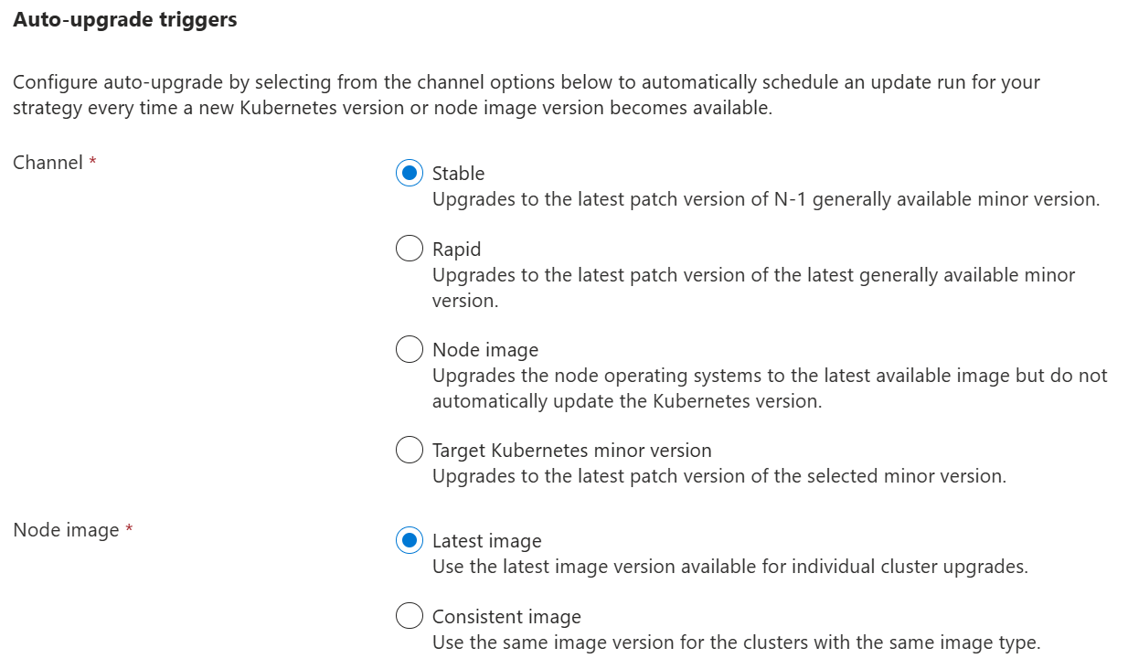 If you select either the Stable, Rapid, or Target Kubernetes minor version (preview) channel, you can choose how node image updates are applied: