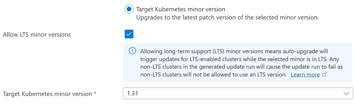 - Target Kubernetes minor version: Select the Kubernetes minor version trigger. Clusters at a lower minor are updated to it first, then only patch updates are applied.