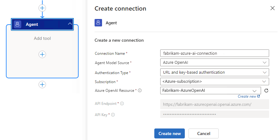 An empty agent connected to a model can respond to prompts that only use the model's capabilities, so an agent doesn't have to include tools. However, for the agent to use actions available in Azure Logic Apps, the agent needs you to create tools. You can start creating a tool by first adding an action from the connectors gallery.
