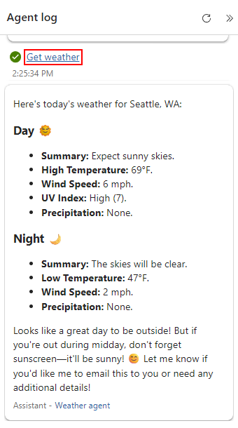 Get weather.On the Details tab, for Description, enter the tool description. For this example, use