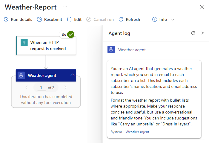 The monitoring view opens and shows the workflow operations with their status. The Agent log pane is open and shows the agent instructions that you provided earlier. The pane also shows the agent's response.