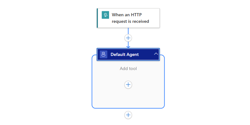The designer shows a partial workflow with the trigger named When an HTTP request is received. Under the trigger, an empty Agent action named Default Agent appears. For this scenario, you don't need any other trigger setup.