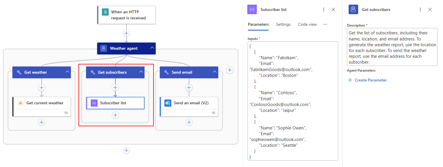 Subscriber list. In the Input box, use the following JSON array but replace the sample subscriber data with the data that you want to use for testing. For example, replace the email addresses with your own so you get the weather for different locations.[ { "Name": "Fabrikam", "Email": "FabrikamGoods@outlook.com", "Location": "Boston" }, { "Name": "Contoso", "Email": "ContosoGoods@outlook.com", "Location": "Jaipur" }, { "Name": "Sophie Owen", "Email": "sophieowen@outlook.com", "Location": "Seattle" } ]The finished Get subscribers tool looks like the following example: