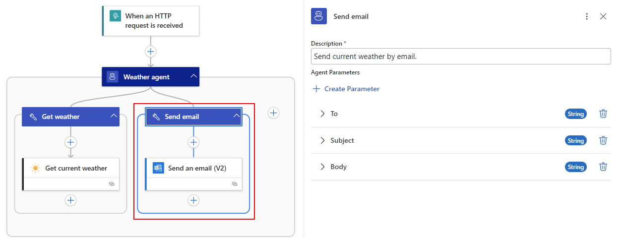 Follow the earlier general steps to create agent parameters for the parameter values in the Send an email (V2) action.