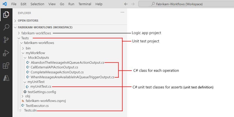 A folder for each unit test definition. This folder includes a C# file that contains a sample class and methods. You use this class and methods to set up your own assertions, confirm that the workflow behaves as expected, and make sure that the workflow behaves reliably and predictably in your larger Azure ecosystem.