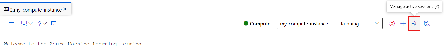 Use the session management panel in Azure Machine Learning studio to help you manage your active sessions and optimize the performance of your compute instance. Navigate to this session management panel from the compute toolbar of either a terminal tab or a notebook tab.