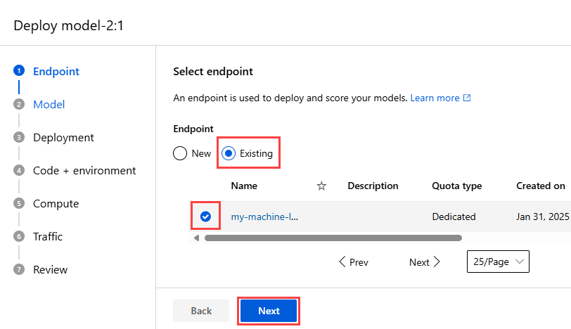 In the list of endpoints, select the managed online endpoint that you want to deploy the model to, and then select Next.