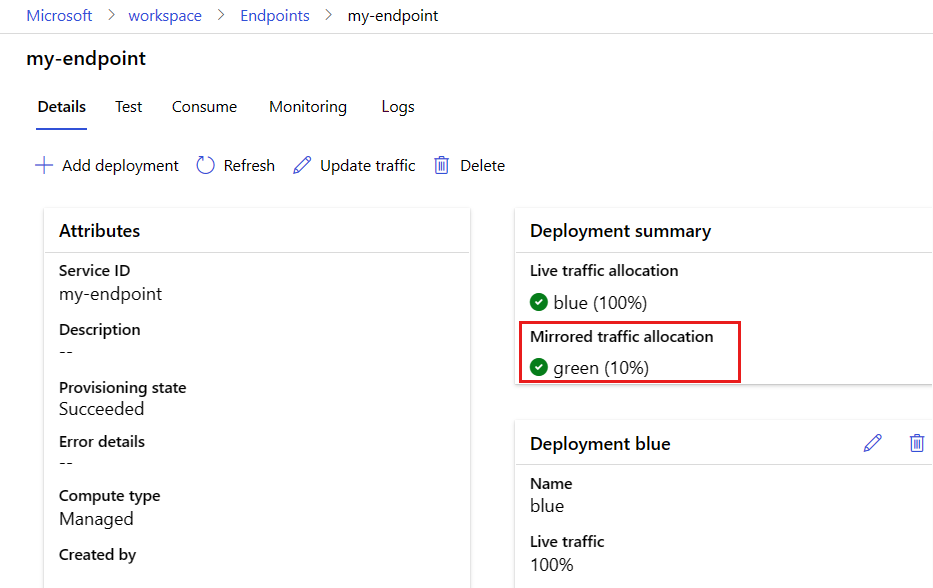The endpoint details page now shows a mirrored traffic allocation of 10 percent to the green deployment.
