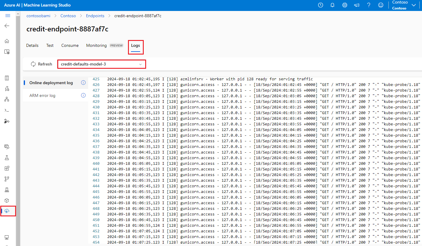 If you use the inference server with an online endpoint, you can also find the logs in Azure Machine Learning studio. On the page for your endpoint, select the Logs tab.