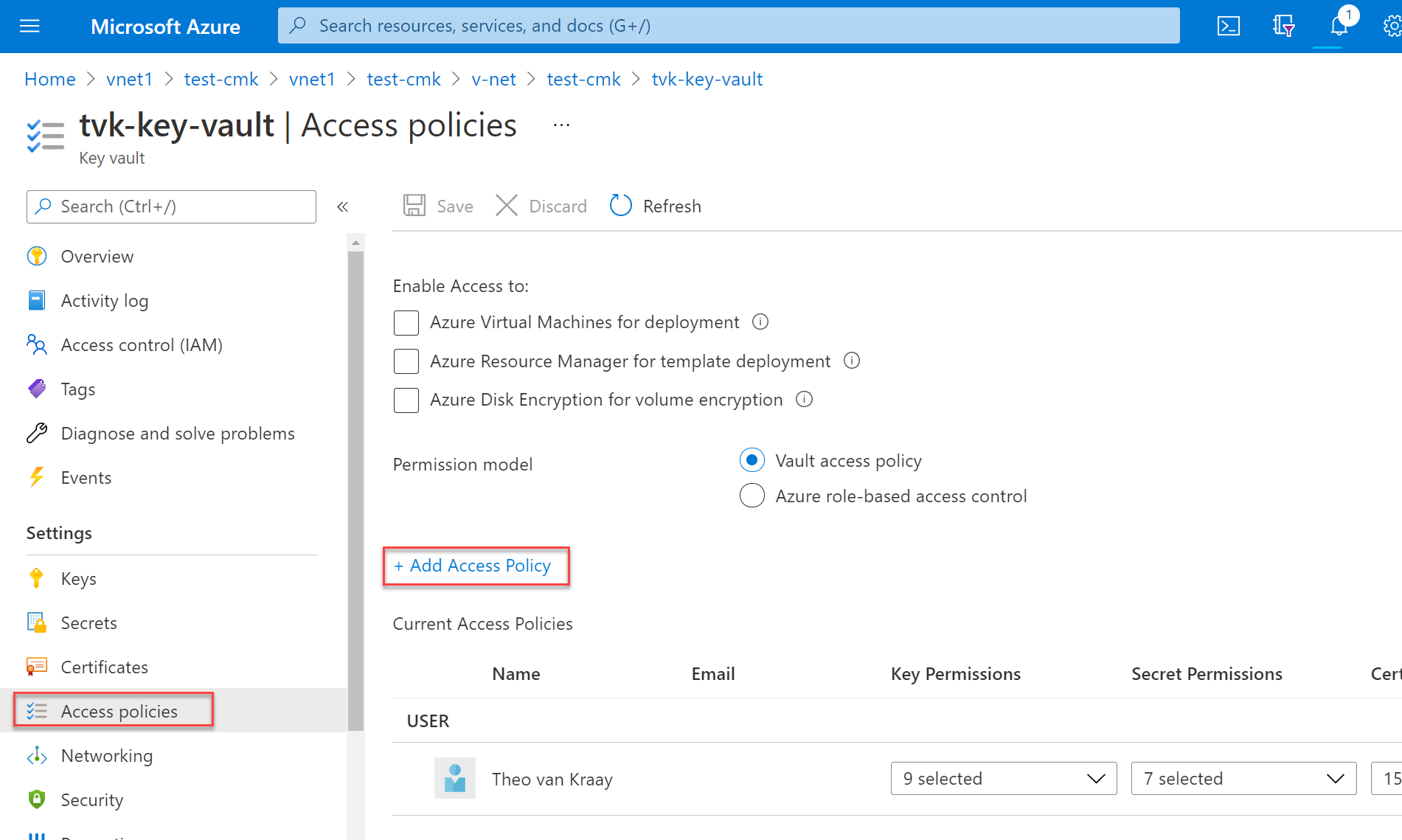 principalIdvalue for later use."identity": { "principalId": "aaaaaaaa-bbbb-cccc-1111-222222222222", "tenantId": "aaaabbbb-0000-cccc-1111-dddd2222eeee", "type": "SystemAssigned" }In the Azure portal, go to your key vault and select Access policies. Then select Add Access Policy to create an access policy for your keys.