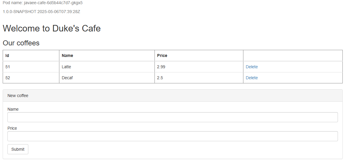 docker run -it --rm -p 9080:9080 -p 9443:9443 \ -e DB_SERVER_NAME=${DB_SERVER_NAME} \ -e DB_NAME=${DB_NAME} \ -e DB_USER=${DB_USER} \ -e DB_PASSWORD=${DB_PASSWORD} \ javaee-cafe:v1Once the container starts, go to