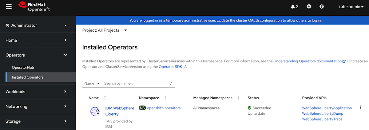 Verify that the appropriate Kubernetes operator for Liberty is installed. In the navigation pane, select Operators, then Installed Operators, as shown in the following screenshot: