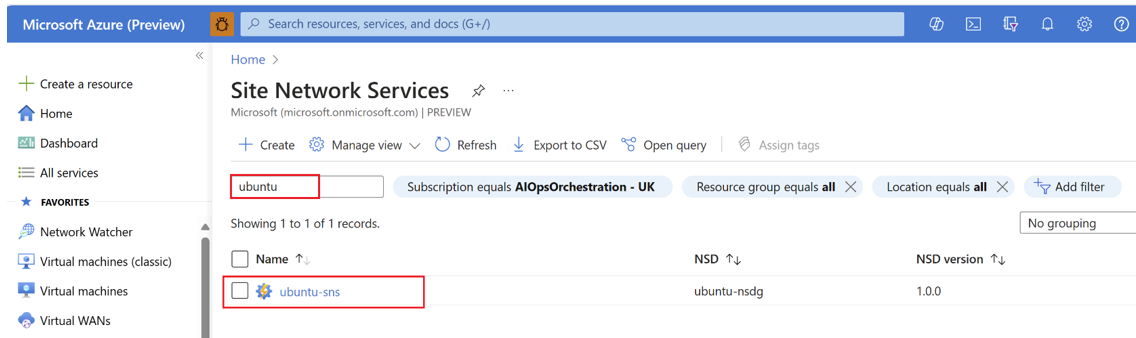 Select the Site Network Service (SNS) within the Azure portal you wish to delete.