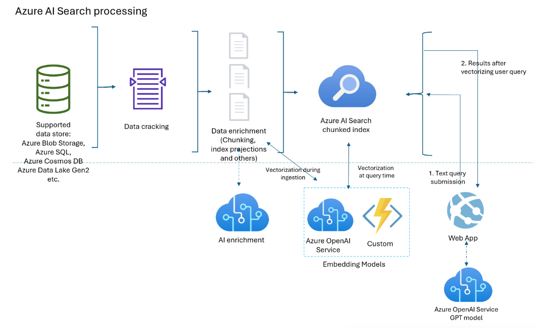 The diagram focuses on integrated vectorization, but your solution isn't limited to this list. You can add more skills for AI enrichment, create a knowledge store, add semantic ranking, add relevance tuning, and other query features.