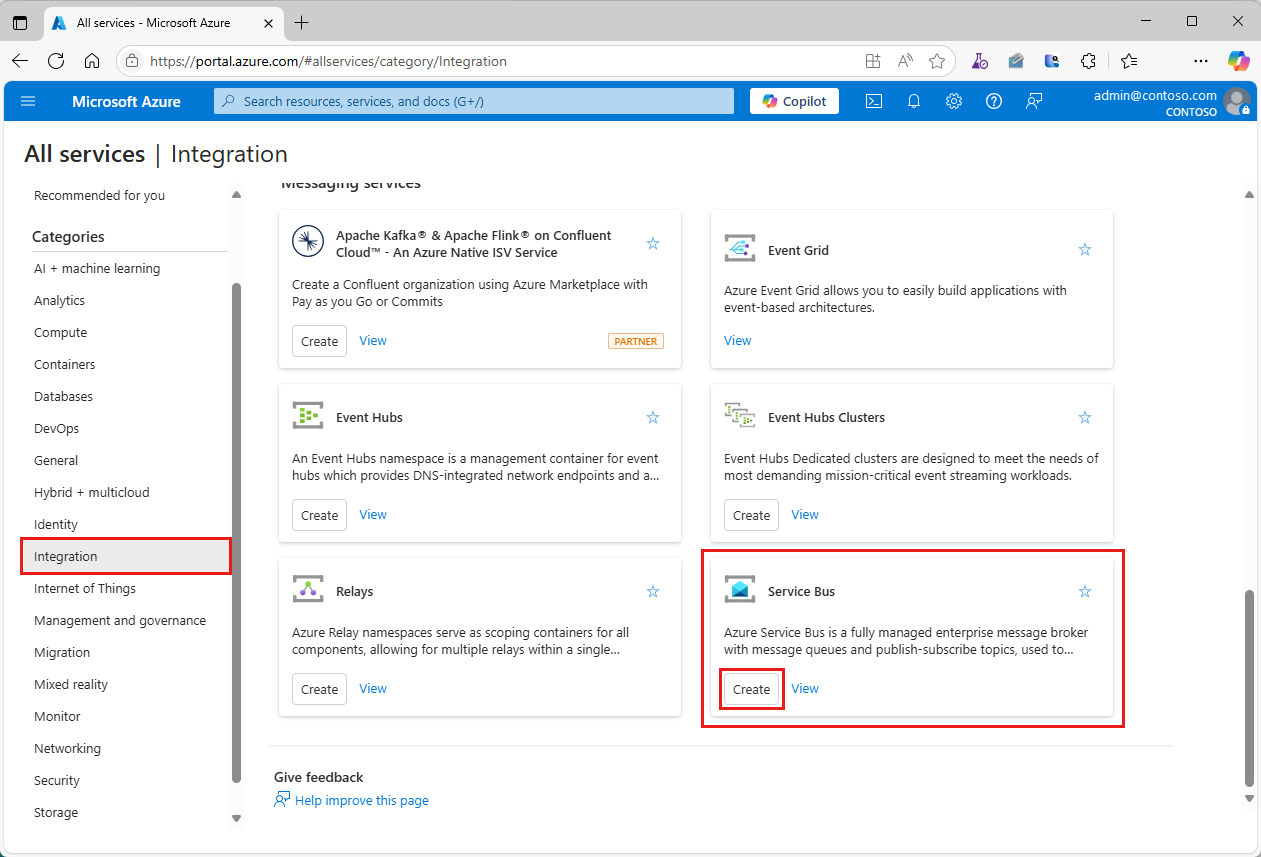 Scroll down to Messaging services > Service Bus and select Create.