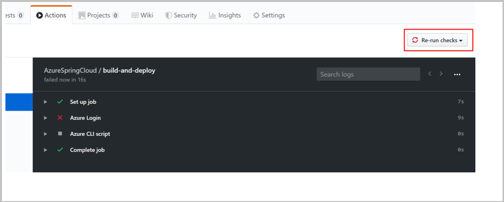 If your action runs in error, for example, if you haven't set the Azure credential, you can rerun checks after fixing the error. On the GitHub repository page, select Actions, select the specific workflow task, and then select the Rerun checks button to rerun checks: