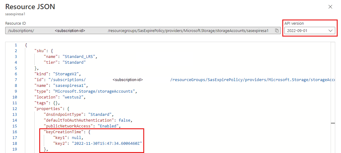 If the keyCreationTime property of one or both of the account access keys for a storage account is null, then you will need to rotate the keys before you can configure a key expiration policy or a SAS expiration policy. You can check the keyCreationTime for a storage account by using the Azure portal, PowerShell, or Azure CLI.