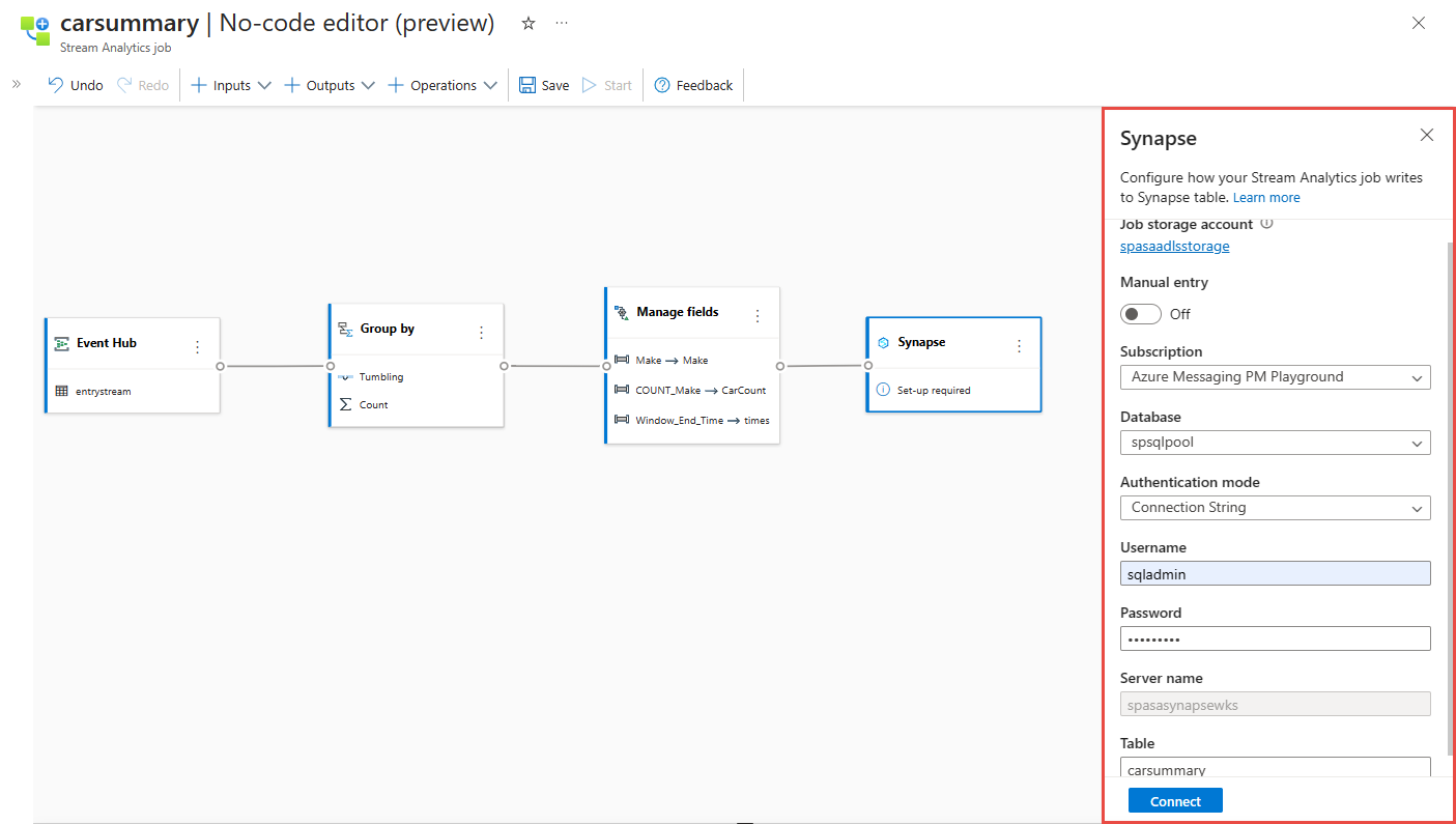 carsummary.Select Connect. You see sample results that will be written to your Synapse SQL table.