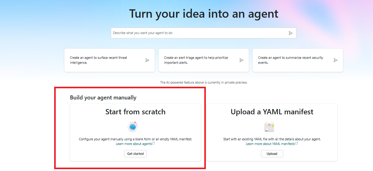 You can create custom agents quickly and intuitively with the new form-based experience. This article explains how to start building your custom agent from scratch using the agent builder in Security Copilot.