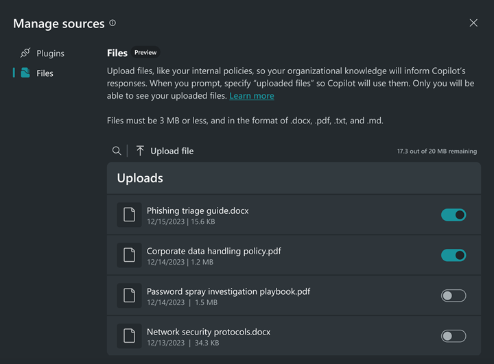 Examples of files you can upload are your organization’s policy and compliance documents, investigation and response procedures, and templates. Integrating this wealth of knowledge into Copilot allows Copilot to reason over the knowledge base or documents and generate responses that are more relevant, specific, and customized to your operational needs.