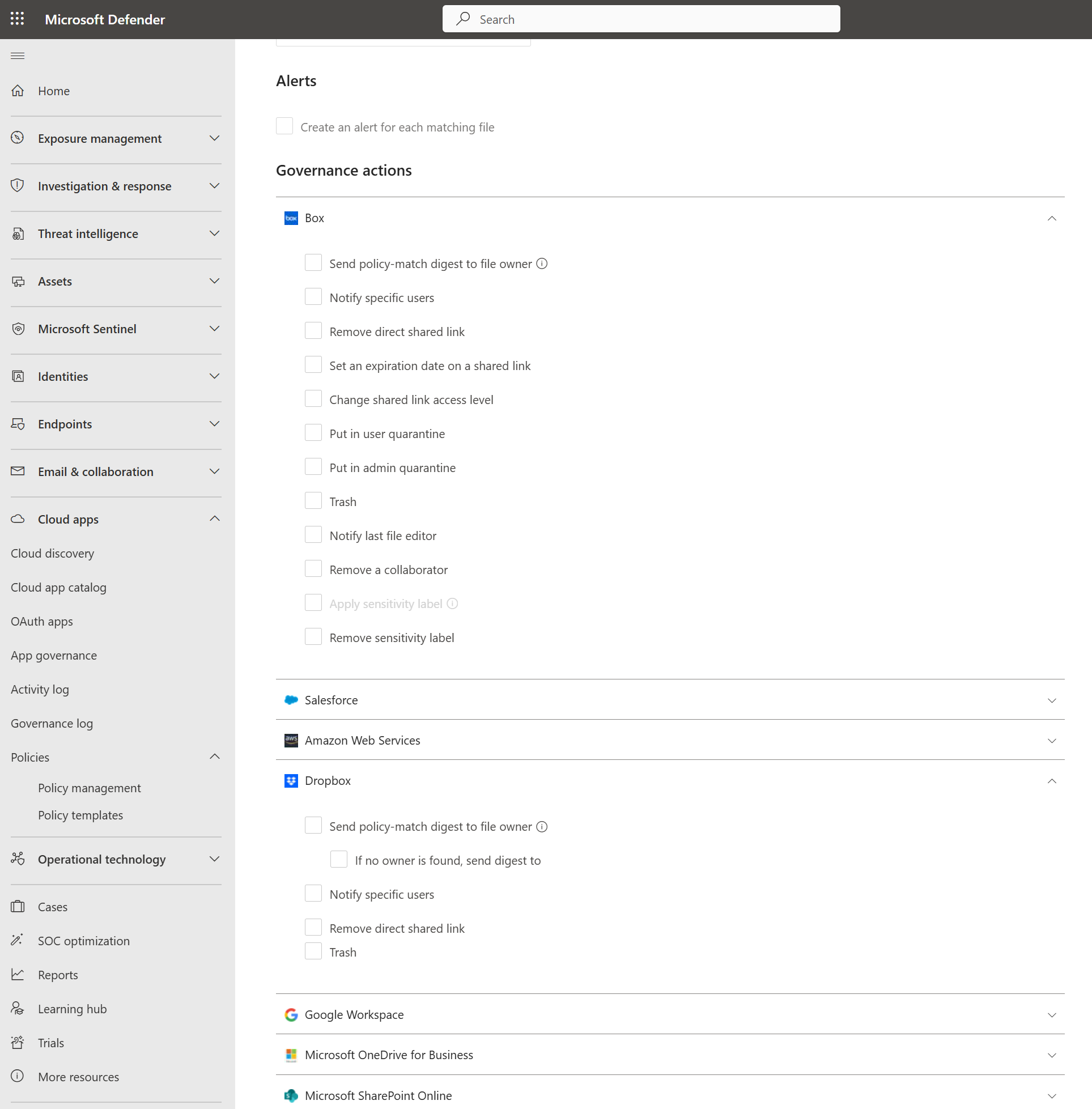 | File policy and Files | File | Apply sensitivity label | Applies a Microsoft Purview Information Protection sensitivity label to files automatically based on the conditions set in the policy. | Box, One Drive, Google Workspace, SharePoint |