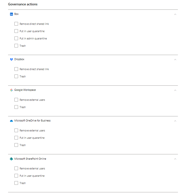 | Files, File policy | File | Put in user quarantine | Removes all permissions from the file and moves the file to a quarantine folder under the user's root drive. This action allows the user to review the file and move it. If it's manually moved back, the file sharing isn't restored. | Box, One Drive, SharePoint |