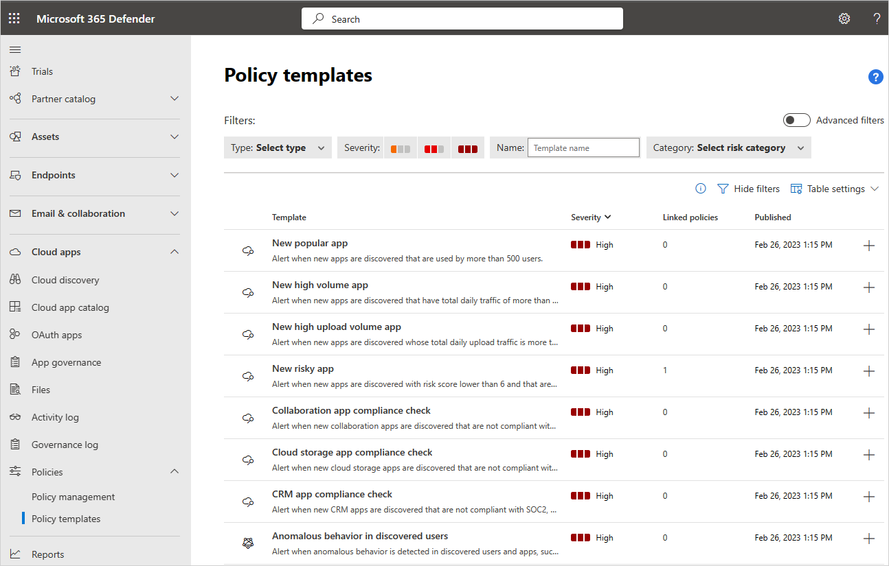 We recommend that you simplify policy creation by starting with existing templates whenever possible. This article lists several policy templates available with Microsoft Defender for Cloud Apps.