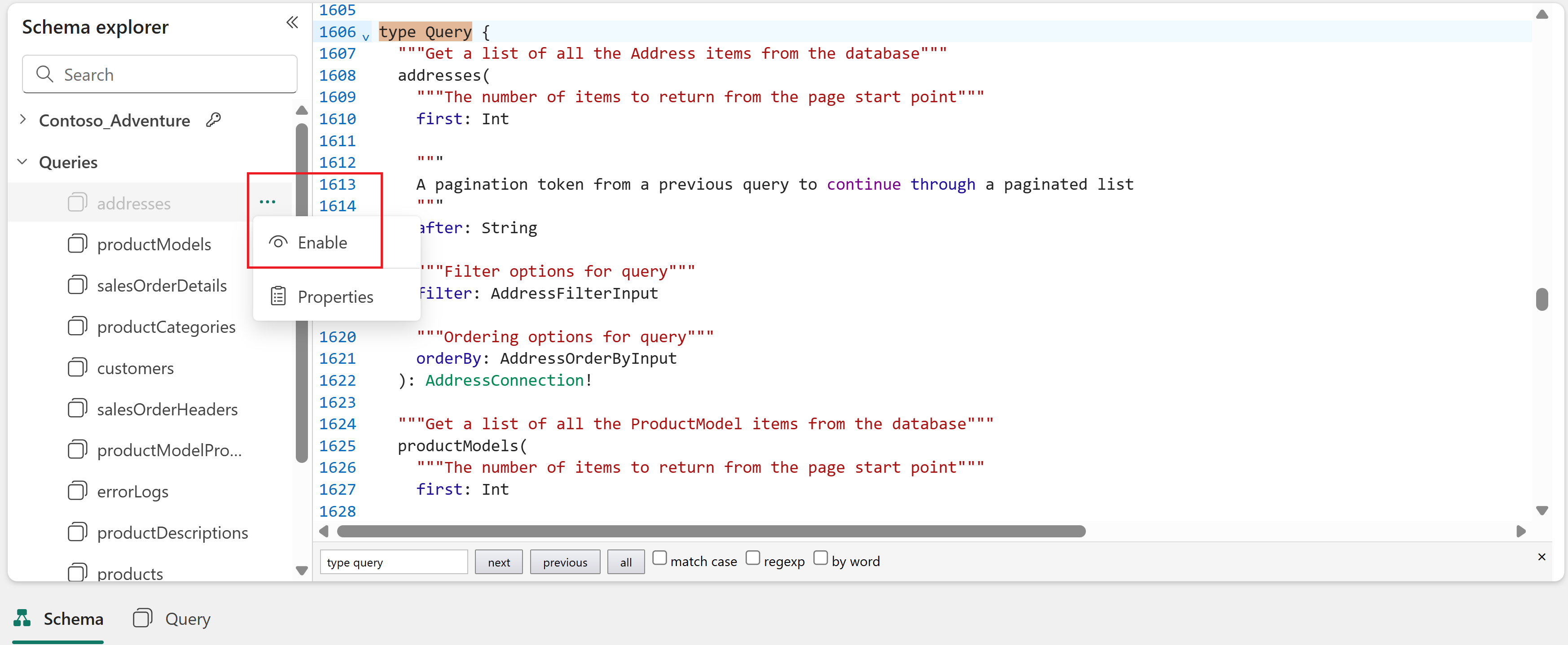 - Enable: Lets you re-enable a previously disabled query or mutation. The query or mutation is immediately available after the schema reload operation that occurs when you select the Enable option.
