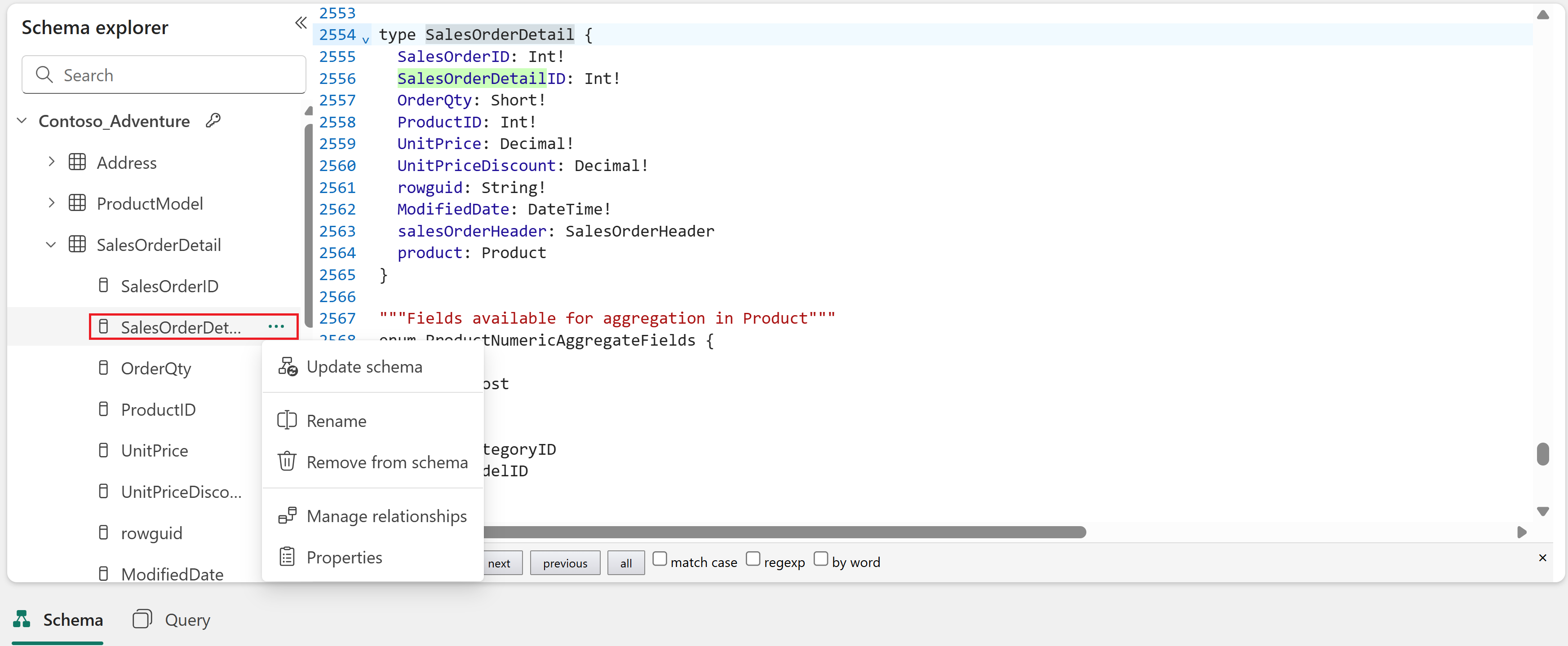 To modify an object, select the ellipsis (...) next to any type in the schema explorer. The following example shows the modification menu for the SalesOrderDetail type:
