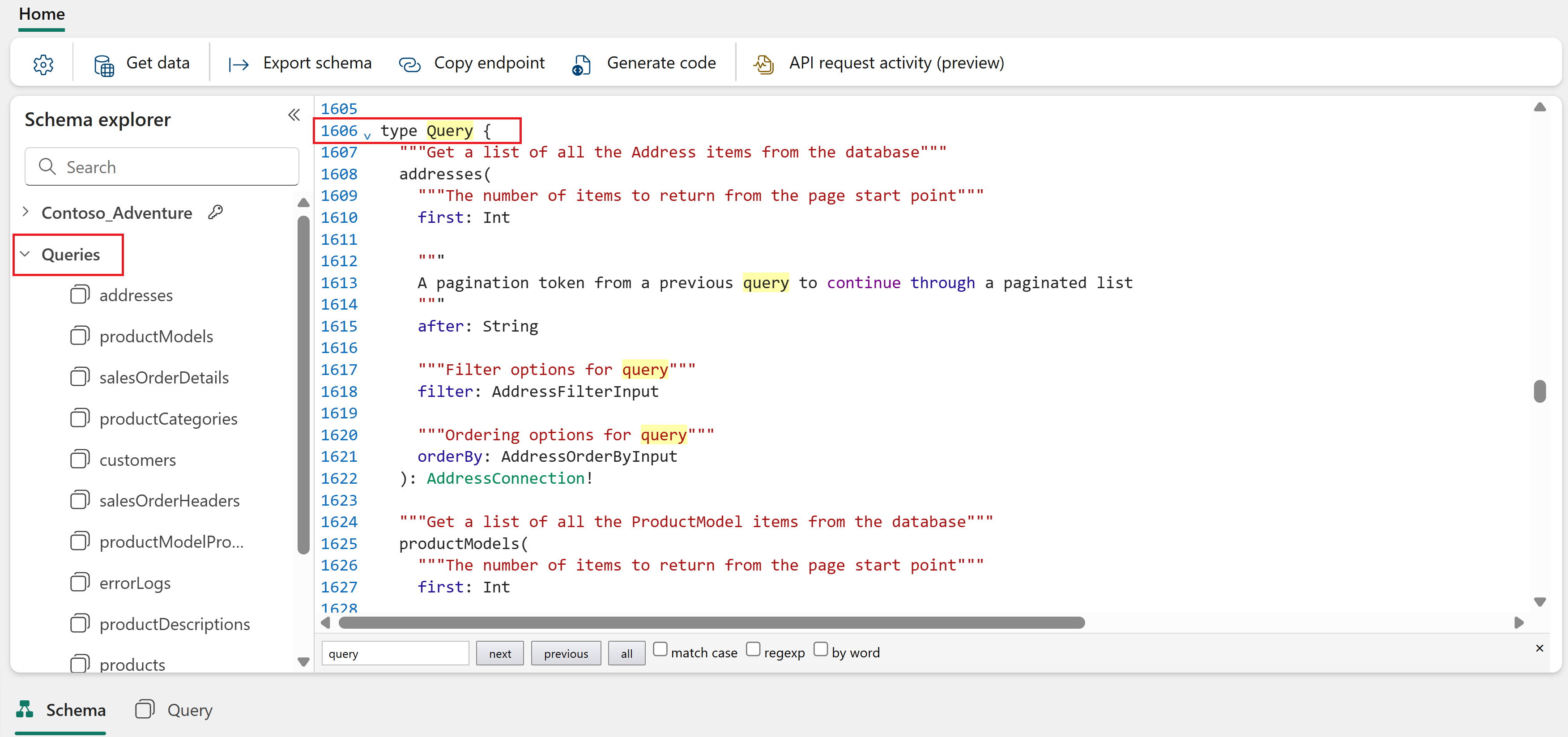 The Schema explorer in the left pane lets you navigate and inspect all the objects in your API. The explorer is available in both the schema view and the query editor, making it easy to explore your API structure while writing queries.