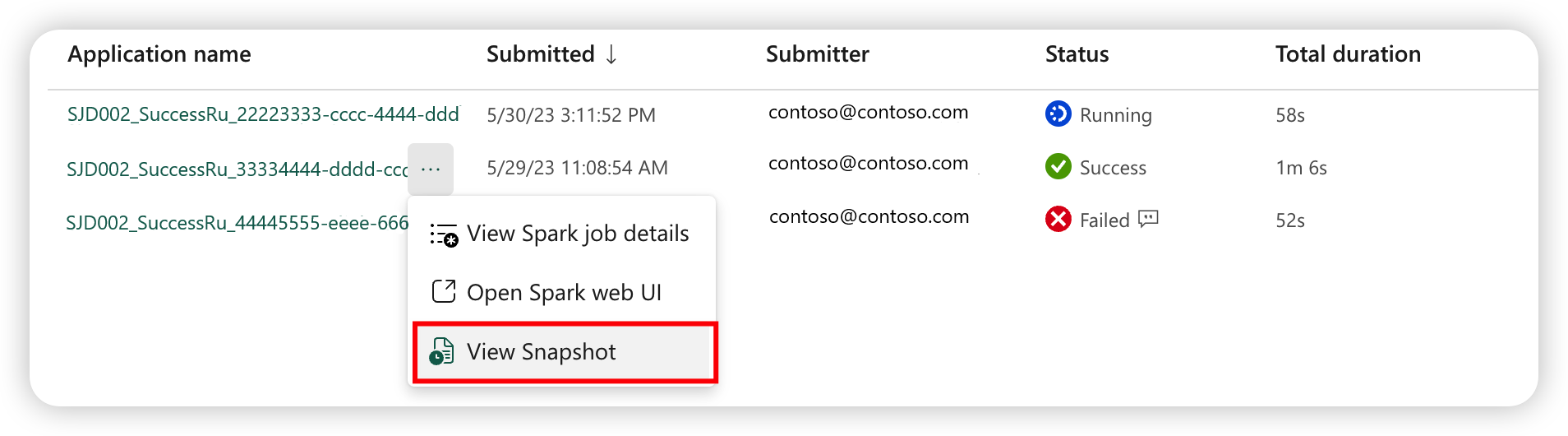 - Save as a Spark job definition: Save the snapshot as a new Spark job definition.