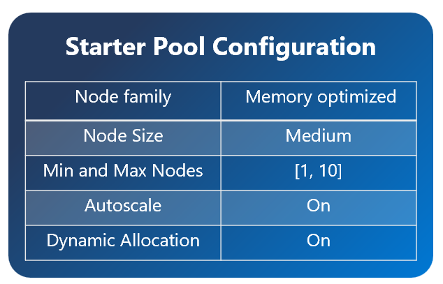 Starter pools are only supported for Medium Node sizes, and selecting any other node sizes, or customizing compute configurations will result in on-demand session start experience which could take from 2 - 5 minutes