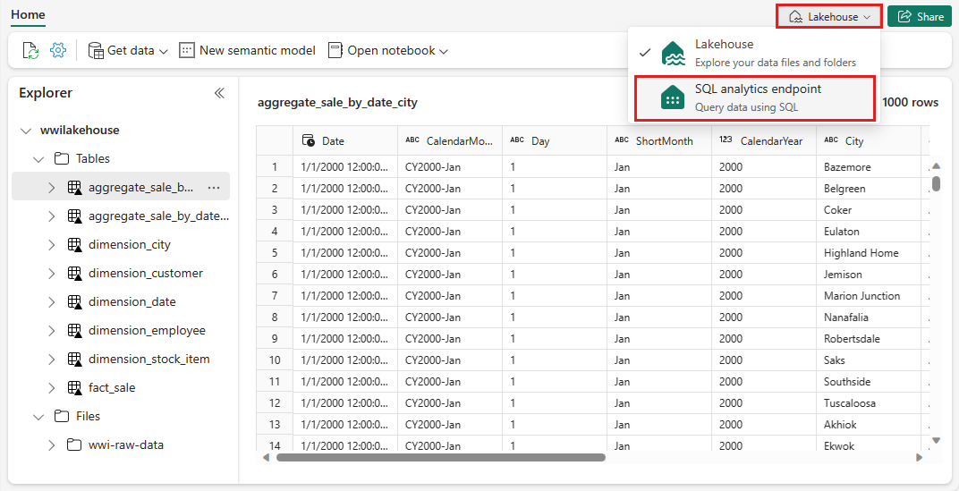 From your wwilakehouse lakehouse, select SQL analytics endpoint from the Lakehouse dropdown menu at the top right of the screen.