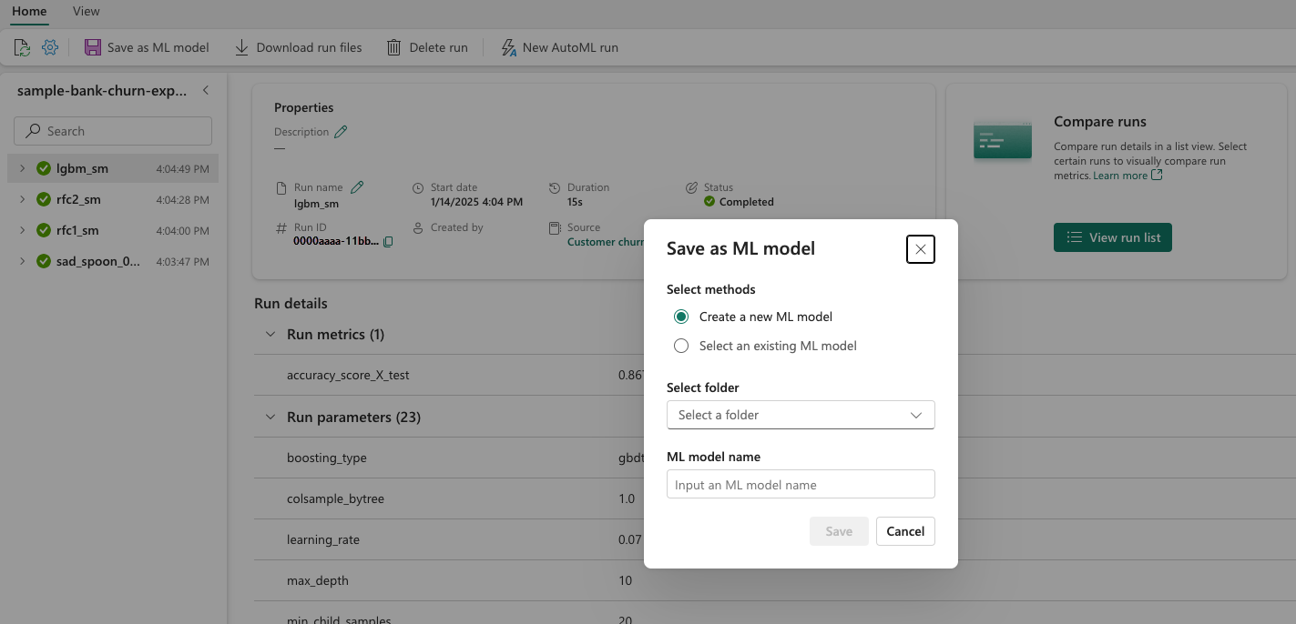 Once a run yields the desired result, you can save the run as a model for enhanced model tracking and for model deployment by selecting Save as a ML model.