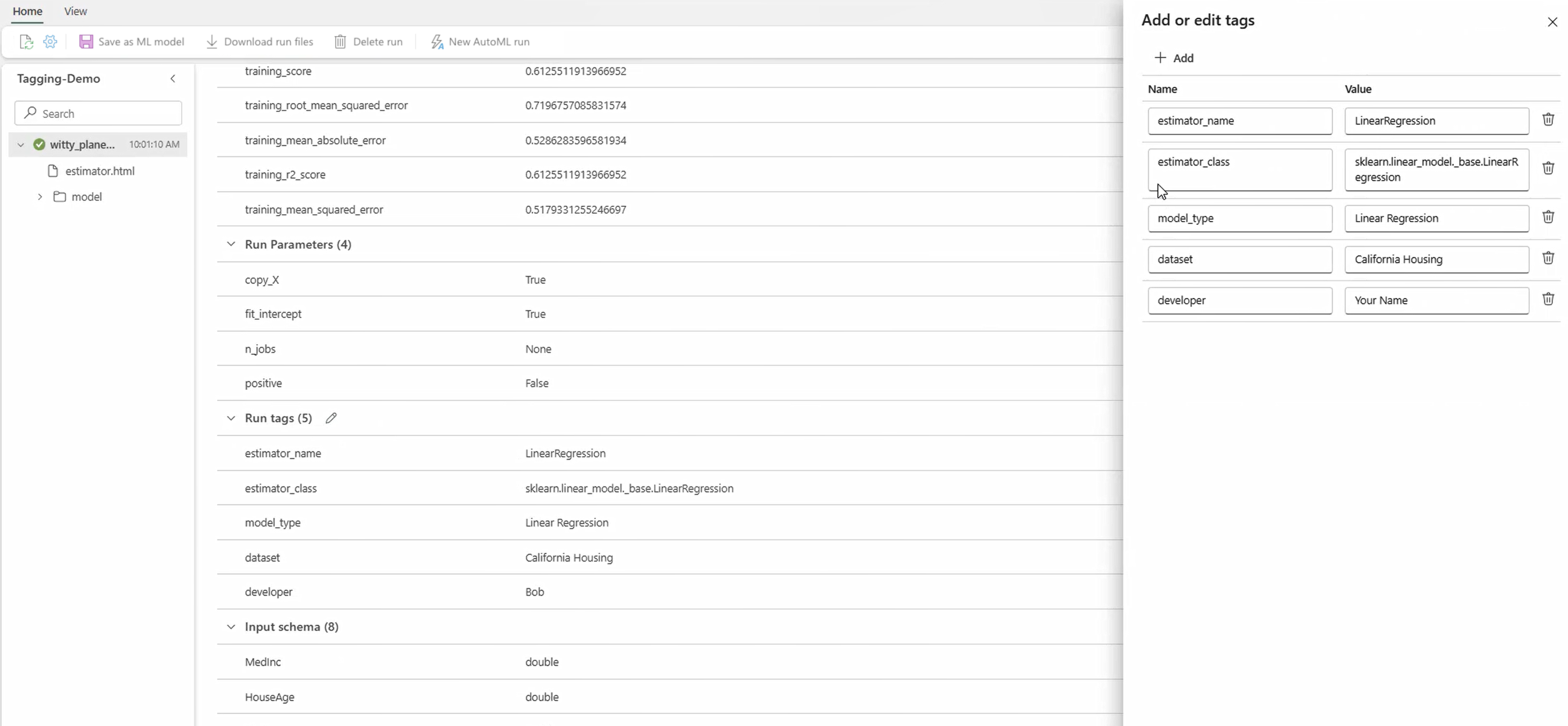 Once the tags are applied, you can then view the results directly from the inline MLflow widget or from the run details page.
