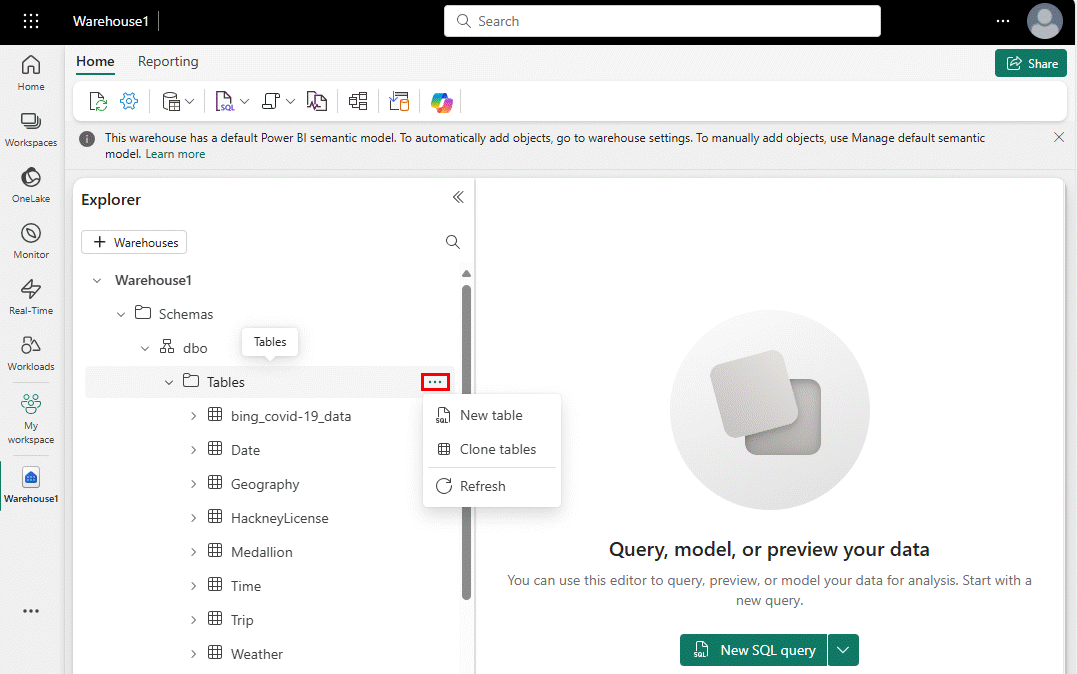 - You can organize, explore, and manage warehouse objects in the object explorer, and execute queries in the SQL query editor.