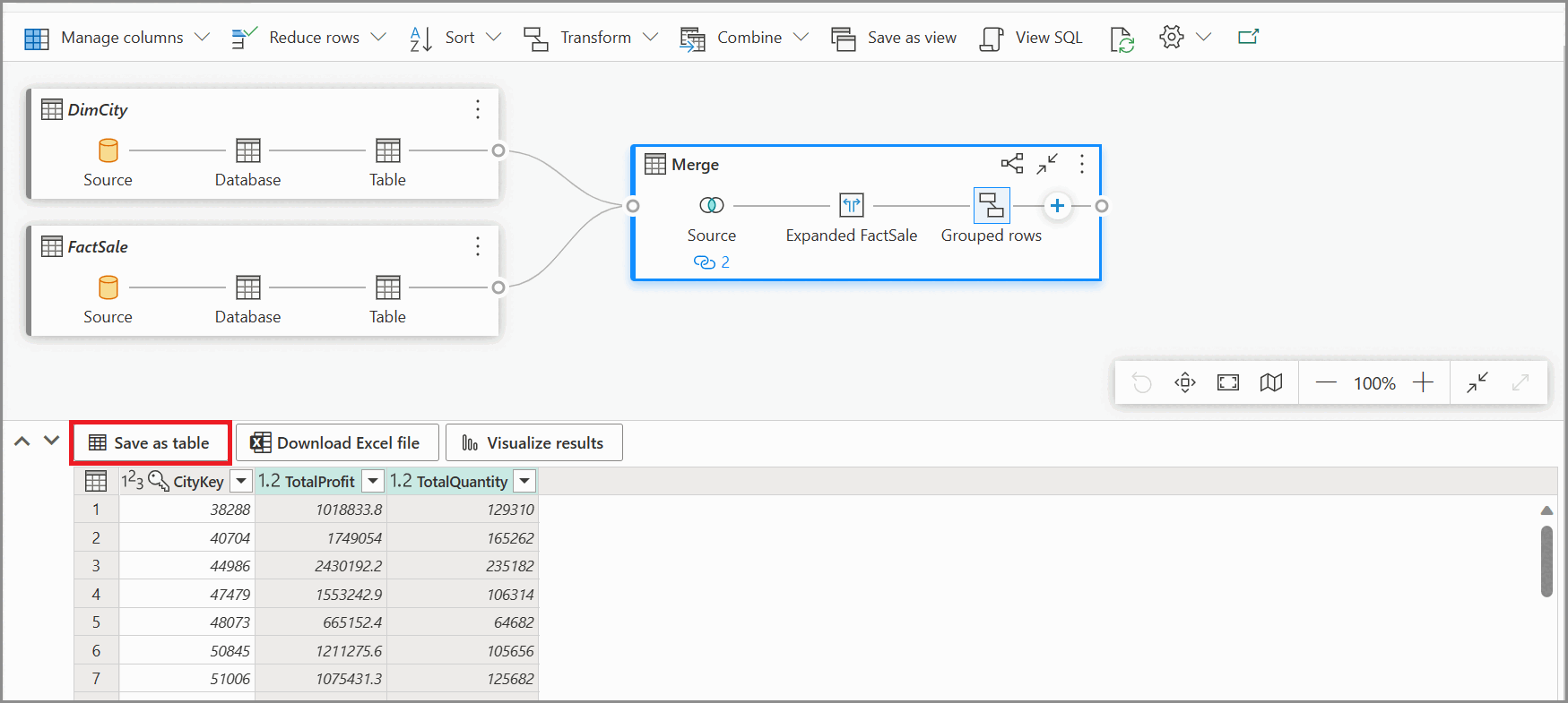 CityKeycolumn in each table is selected to be the common key. The Join kind is Inner. - The new Merge operator is added to the visual query editor.