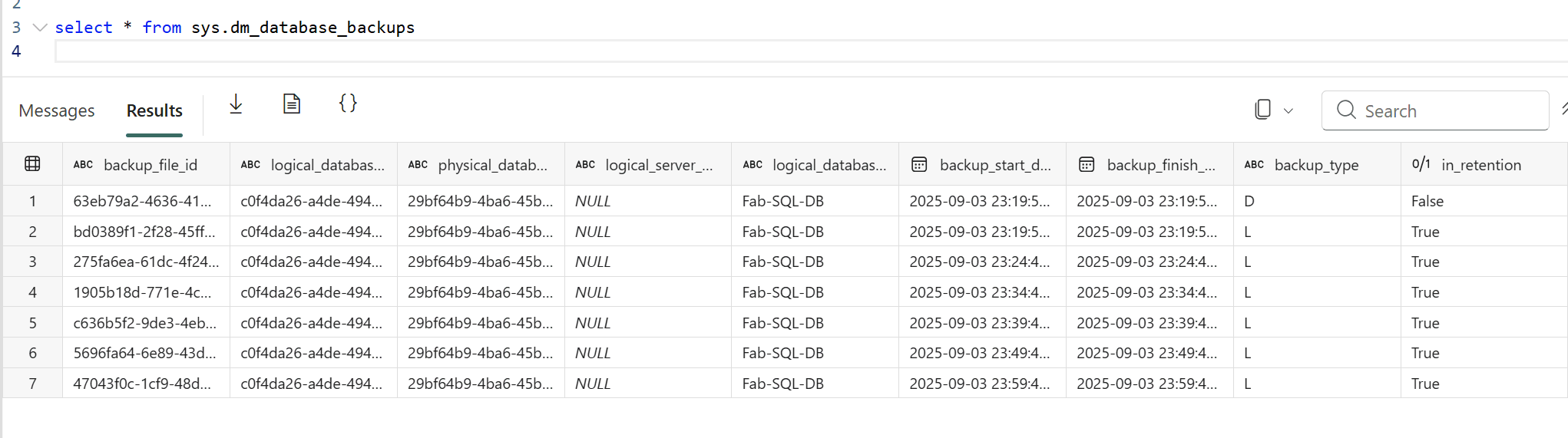 To query backup history catalog, run this T-SQL query in the Fabric portal or query tool of your choice: