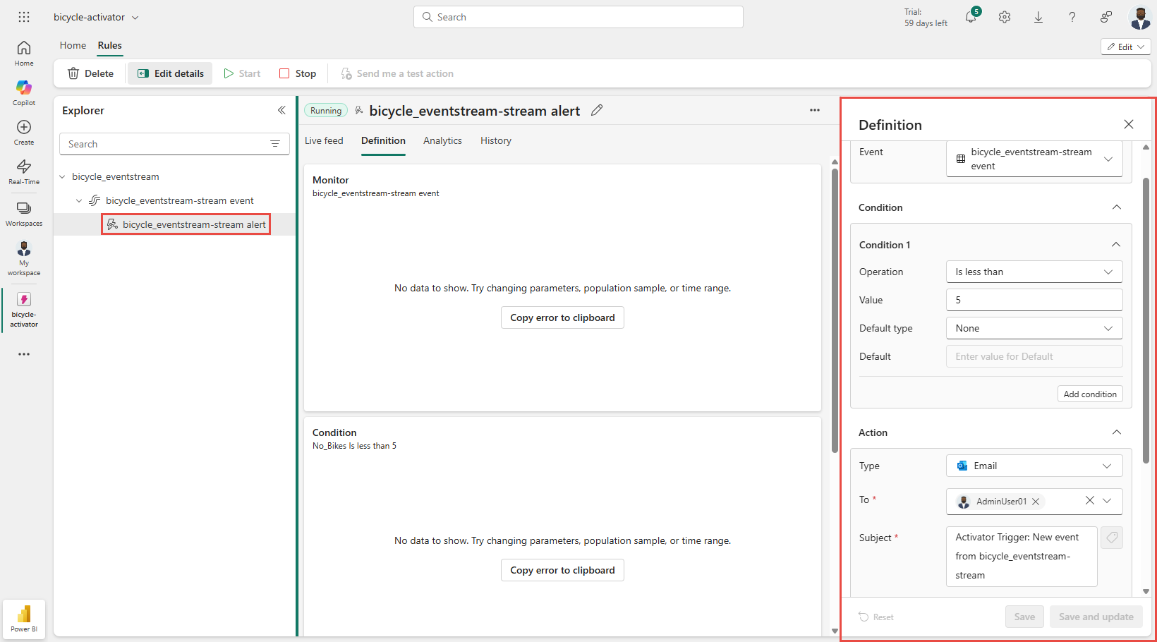 You see the Activator item in the Fabric Activator editor user interface. Select the rule if it's not already selected. You can update the rule in this user interface. For example, update the subject, headline, or change the action from email to Teams message.