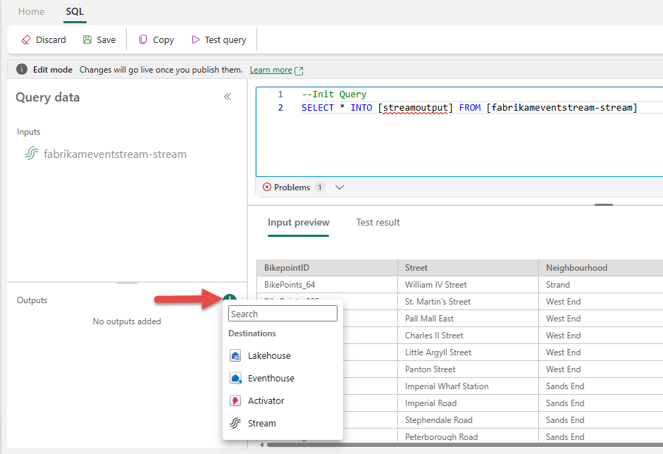 Select the text in the Outputs section, and then enter a name for the destination node. The SQL operator supports all Real-Time Intelligence destinations, including an eventhouse, lakehouse, activator, or stream.