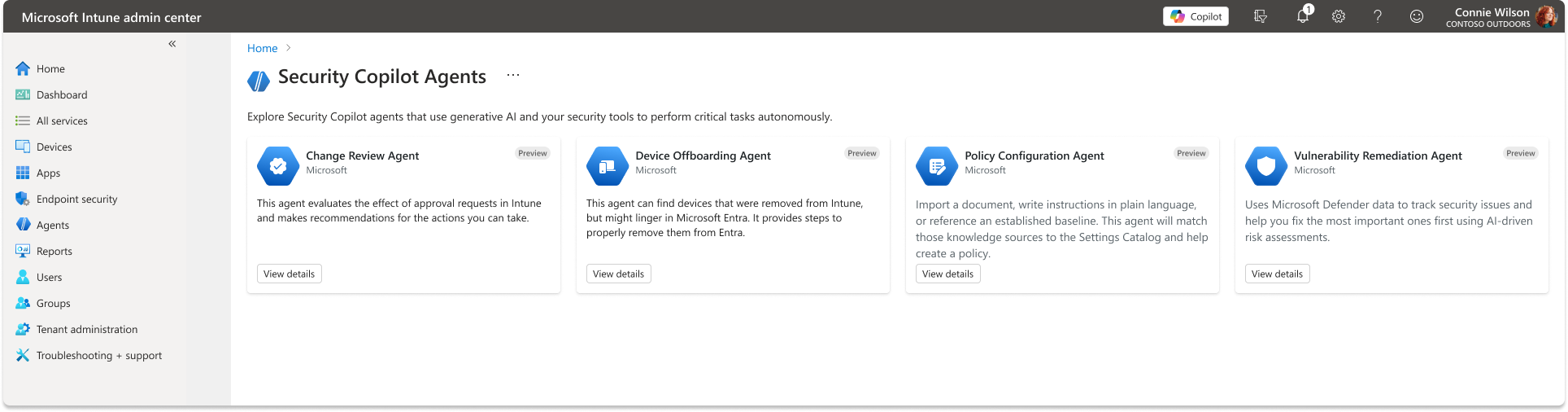 Microsoft Intune includes specialized Security Copilot agents, each designed for a specific security scenario. The following agents are available: