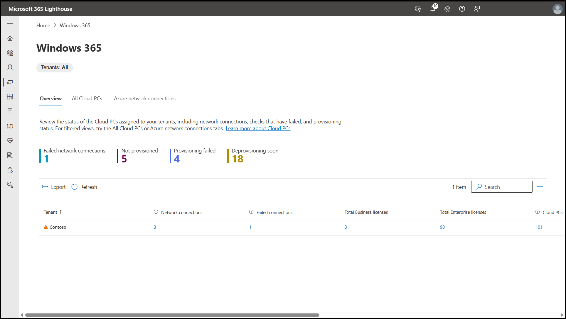 Once you've provisioned Cloud PCs for your customer tenant, the Windows 365 card on the Microsoft 365 Lighthouse Home page provides a brief alert on the Cloud PCs in need of action, such as the number of Cloud PCs that failed to provision and Azure network connection failures. To get a detailed status, select the button on the Windows 365 card (or select Devices > Windows 365 in the left navigation pane in Lighthouse) to open the Windows 365 page. From this page, you can get a status overview of the Cloud PCs assigned to your customer tenants, view a list of all the Cloud PCs you manage and the tenants they're assigned to, and view the Azure network connections between your customer tenants and Microsoft Entra ID and their status.