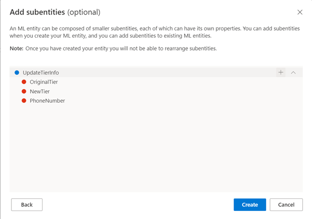 In this example, we will be creating two entities, "UpdateTierInfo" as a machine-learned entity type, and "Tier" as a list entity type. Luis also lets you create different entity types.