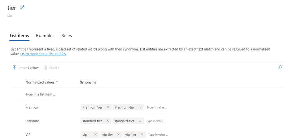 We will create another entity named "Tier", but this time it will be a list entity, and it will include all the tiers that we might provide: Standard tier, Premium tier, and VIP tier.