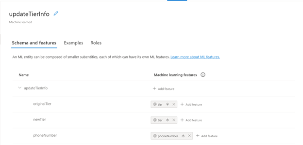 We added tier as a feature for both "originalTier" and "newTier", and we added the "Phonenumber" entity, which is a Regex type. It can be created the same way we created an ML and a list entity.