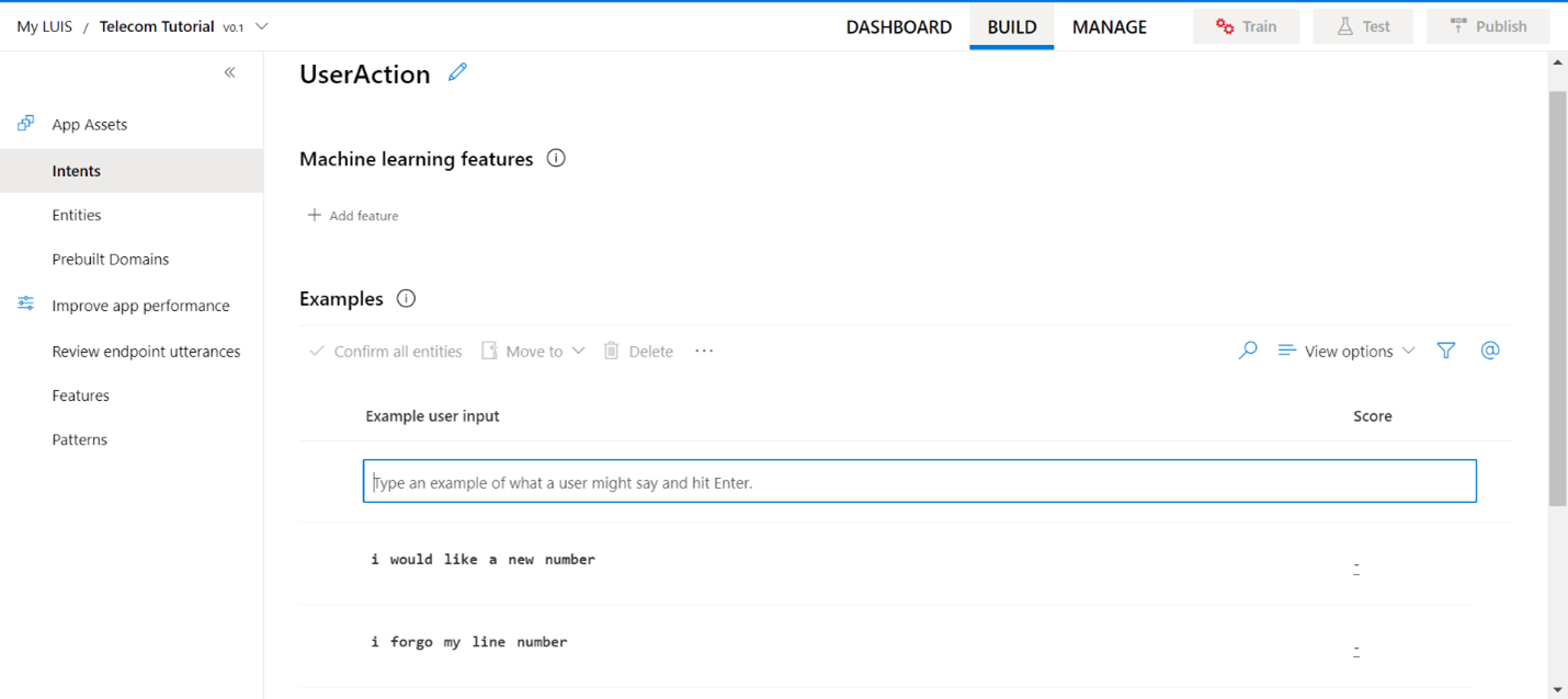 Select Build from the top navigation menu, then select Intents on the left side of the screen. Select + Create to create a new intent. Enter the new intent name, "UserAction", then select Done