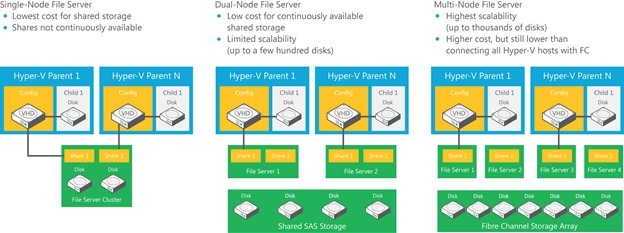 The three most common file server configurations for Hyper-V over SMB are a single-node file server, a dual-node file server, and a multi-node file server, as shown in the following figure.